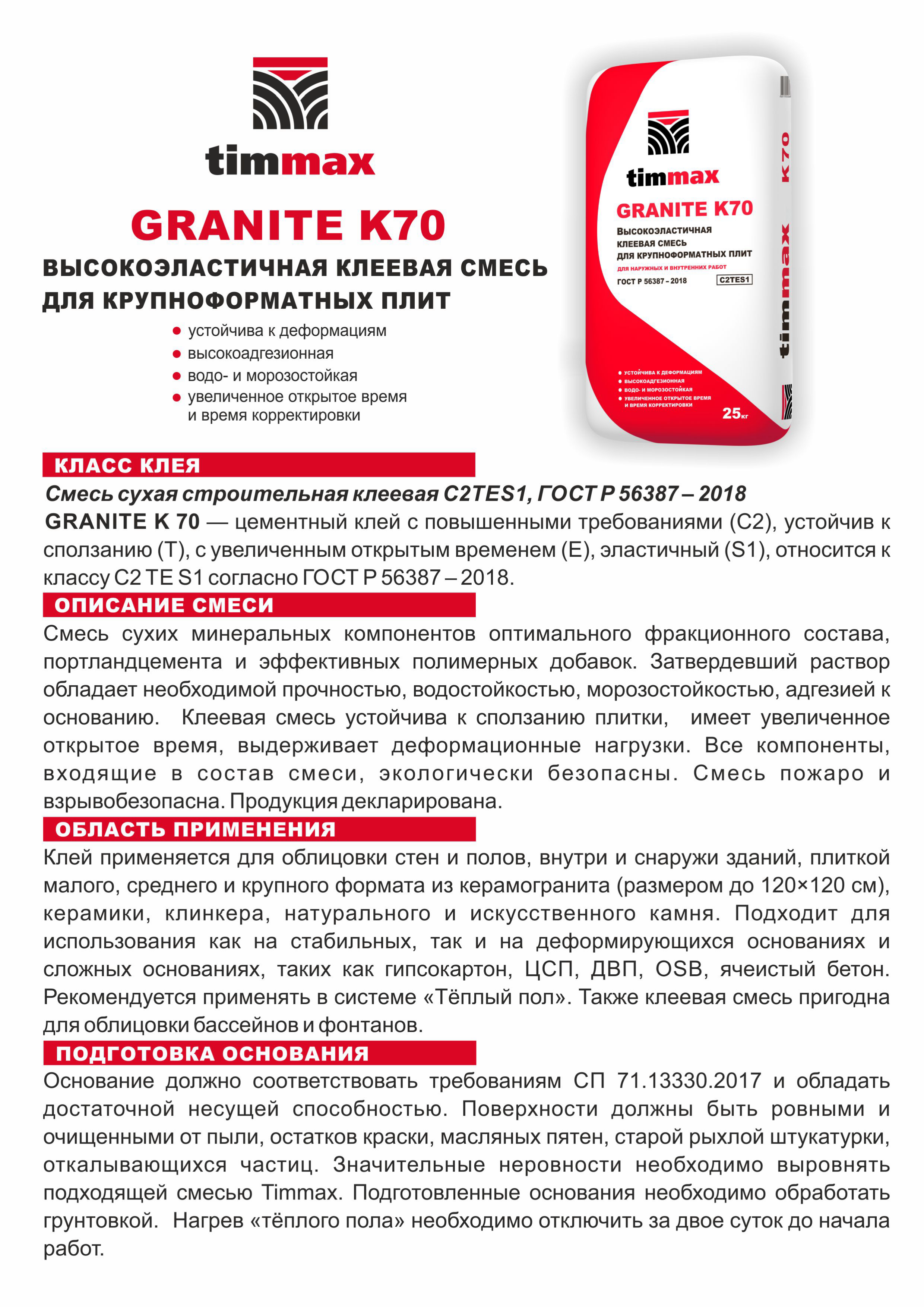 Смесь сухих минеральных компонентов оптимального фракционного состава, портландцемента и эффективных европейских полимерных добавок. Затвердевший раствор обладает необходимой прочностью, водостойкостью, морозостойкостью, адгезией к основанию. Клеевая смесь устойчива к сползанию плитки, имеет увеличенное открытое время, выдерживает деформационные нагрузки. Все компоненты, входящие в состав смеси, экологически безопасны. Смесь пожаро и взрывобезопасна. Продукция декларирована.